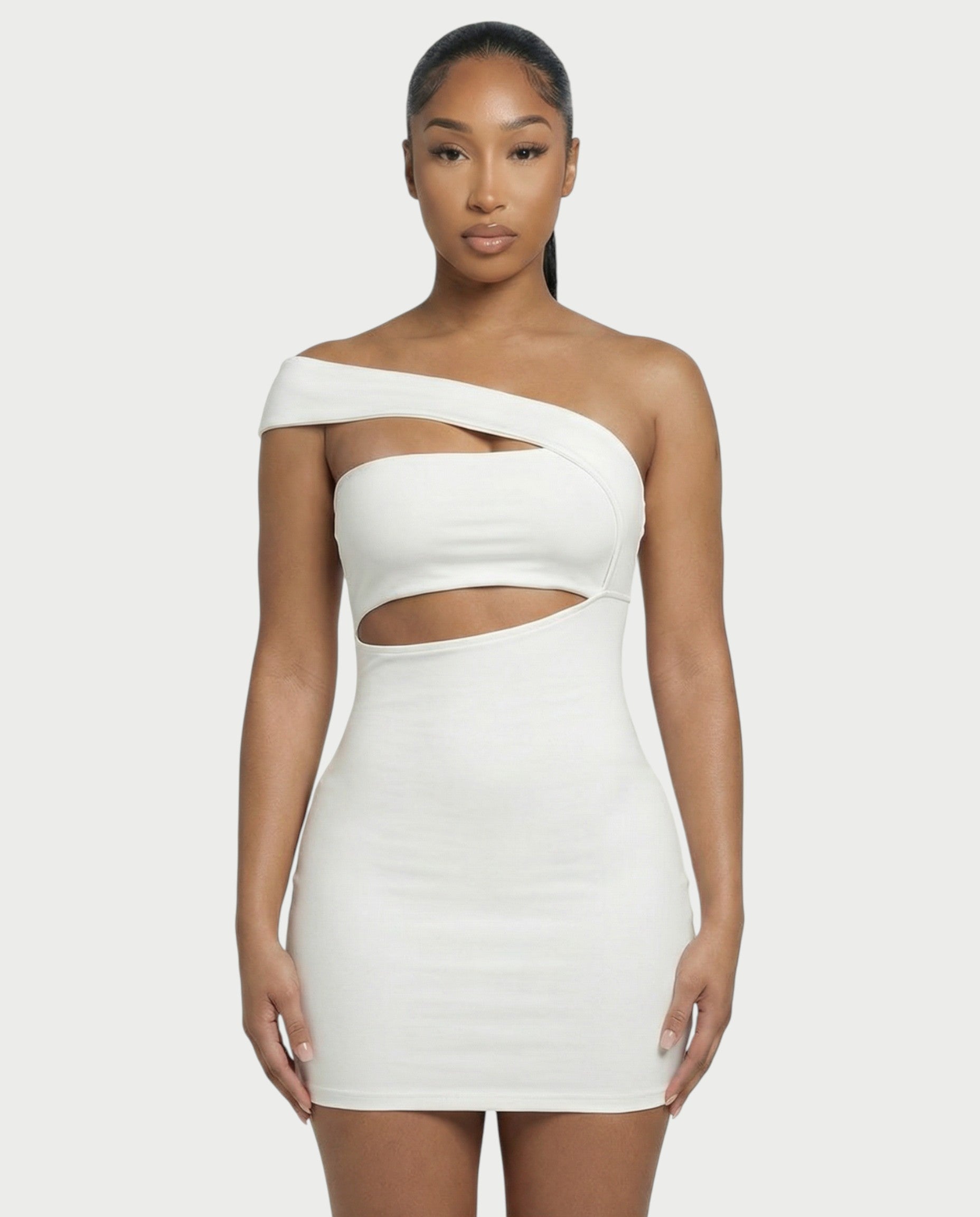 The Morgan Dress is pure elegance with a daring twist. Featuring an asymmetric neckline, a bold cutout, and a figure-hugging fit, this white-hot look guarantees all eyes on you.